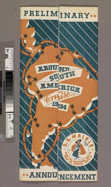 "A314-67-(152-250M-434) printed in U. S. A."--back cover, bottom. "Warren R. Flynn, Santa Fe Railway... Pasadena, California"--back cover. Preliminary announcement of around South America cruise ; including a condensed itinerary, cruise details, fares, and accommodation descriptions. Focus of item: Malolo.