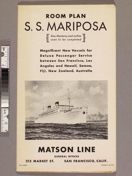 "Form OX94 printed in U. S. A."--front cover, bottom. "The ask Mr. Foster travel information service New Hotel Rossyln Los Angeles, Cal."--front cover, stamped, purple ink. Deck plans for the SS Mariposa. Focus of item: Mariposa ; Monterey ; Lurline.