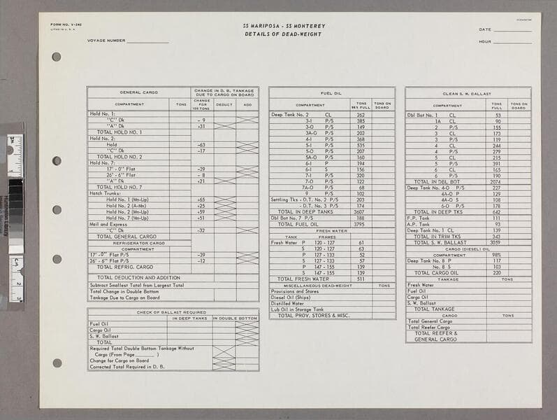 The form shows the Inboard Profile, Hold, and Inner Bottom; in the upper-right hand corner is space for the date, hour, and condition of loading; in the upper left hand side is space for the voyage number. Form is hole-punched along left margin. Focus of item: Mariposa (1956-) ; Monterey.