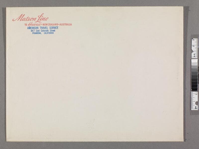 "A 314-13 (414-175M-238)"--printer's note, back cover, lower left, small type. "Copyright 1938 Matson Navigation Company"--p. [2], lower left corner, small type. "American travel service... Pasadena, Calif."--stamped, blue ink, back cover. Promotional information for Matson-Oceanic travel to Hawaii and the South Seas; including Hawaiian hotel accommodations, trip offerings, and fares. Focus of item: Lurline ; Mariposa ; Monterey ; Malolo.