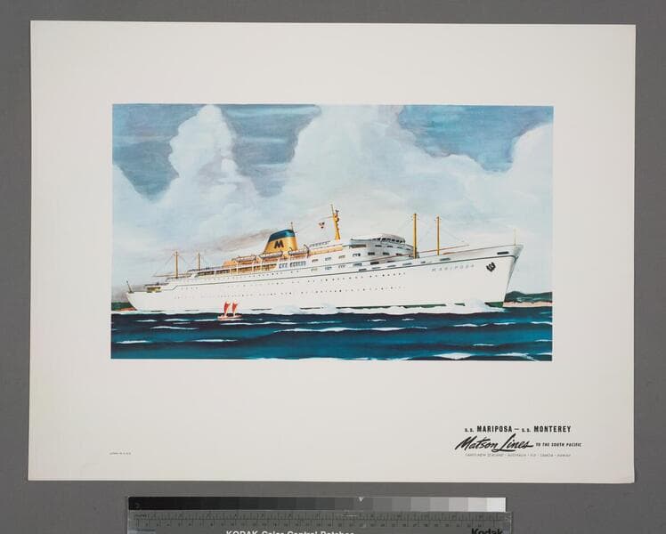 Image is pasted to a board with a stand; could be used as advertisement in a travel agency. "S.S. Lurline Matson to Hawaii"--below the image in the lower right corner. This image depicts the Lurline as she was after her wartime service as a troopship and subsequent conversion back into a passenger liner. Image appears to be a copy of the prewar image seen in priMISC/M KM0181, with alterations made to the ship to bring it in line with the postwar conversion; q.v. the stacks and the bow. "Pomona Travel Agency[,] Charlotte Davis[,] 106 So. Thomas St. Ly. 2-6919[,]Pomona, California"--on verso, stamp in green ink, lower right corner. The Lurline operated from 1932 to 1941, and then, after World War II service as a transport, from 1948 to 1963 for the Matson Navigation Company; she was the third vessel so named. Focus of item: Lurline (1932-1963).