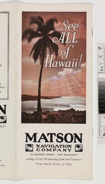 "B. K. Ayers 286 Patriot Bldg Concord, N. H."--stamped, red ink, front cover. "A-213 (26MMP230)"--printer's note, back cover, lower left corner. Promotion for Matson's Hawaiian tour packages, with guide to Hawaii, fares, schedules and itineraries. "Issue of February 15, 1930"--front cover.