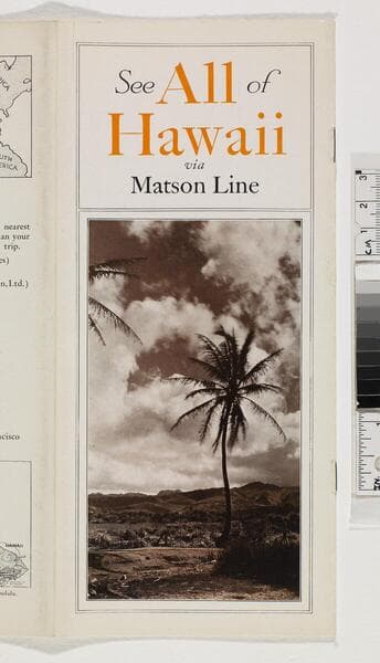 "P-213--25M--8-26--J. K."--printer's note, back cover, lower left corner. Matson's service to Hawaii; including trip itineraries, fares, and map of the Hawaiian Islands.