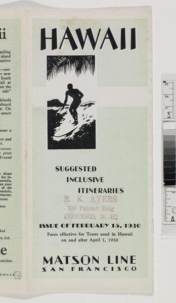 "Itineraries and rates herein applicable for sailings January through December 1953... issued December 1, 1952"--back cover, bottom. "OCT 2 1953 / Pomona travel agency... Pomona, California"--stamped, black ink, back cover. Advertisement for tours of Hawaii; including itineraries, fares, vessel description, and details of Matson's Waikiki hotels. Focus of item: Lurline.