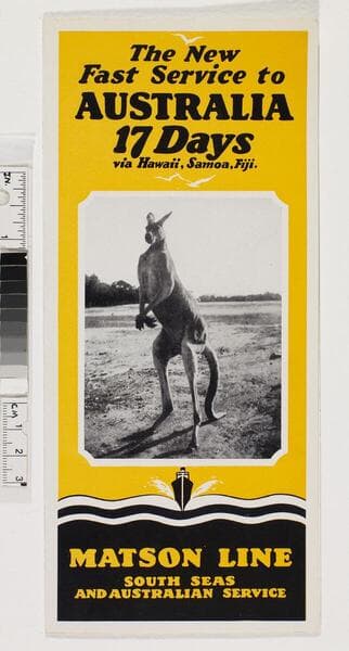 "AO-71-10M-7-28-I. R. Co."--printer's note, p. [3], lower left corner. Agency's stamp mark on front and back covers. Advertisement for Matson's service to Australian, highlighting the speed of the trip.