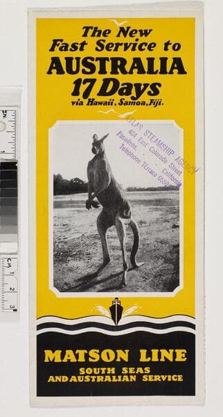 "A314-13 (385-200M 937)"--printer's note, back cover, upper left corner. "Copyright 1937 -- Matson Navigation Company"--p. [1]. "Kelso travel bureau... Pasadena, California"--back cover. Advertisement for Matson travel services to Hawaii, South Pacific and Australia; including voyages and hotel accommodations. Focus of item: Lurline ; Mariposa ; Monterey ; Malolo.