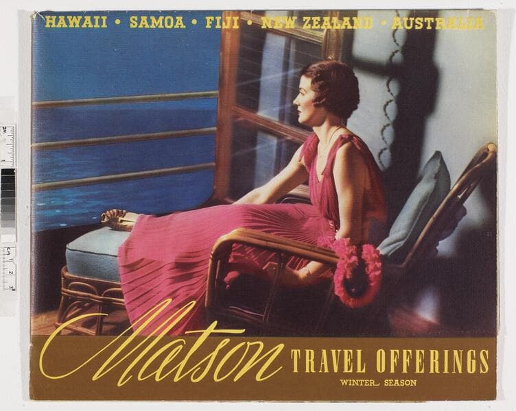 "A 314-13 (414-175M-938)"--printer's note, back cover, small type. "Copyright 1938. Matson Navigation Company"--p. [1], bottom, small type. "American travel service... Pasadena, Calif."--stamped, blue ink, back cover. Advertising pamphlet for Matson-Oceanic cruises to Hawaii and the South Seas; including destination information, cost, trip itineraries, regulations, and a illustrated route map. Focus of item: Lurline ; Mariposa ; Monterey ; Matsonia.