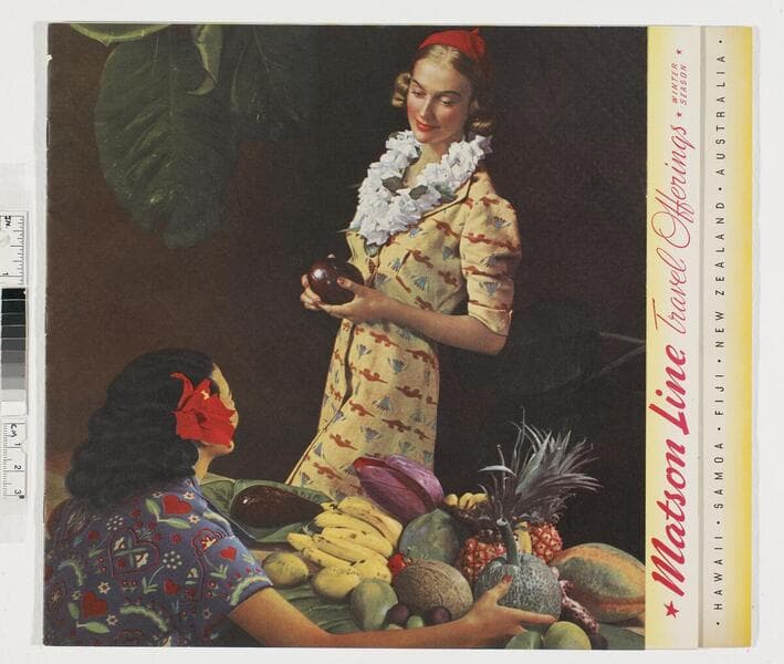 "A 314-13 (414-175M-238)"--printer's note, back cover, lower left, small type. "Copyright 1938 Matson Navigation Company"--p. [2], lower left corner, small type. "American travel service... Pasadena, Calif."--stamped, blue ink, back cover. Promotional information for Matson-Oceanic travel to Hawaii and the South Seas; including Hawaiian hotel accommodations, trip offerings, and fares. Focus of item: Lurline ; Mariposa ; Monterey ; Malolo.