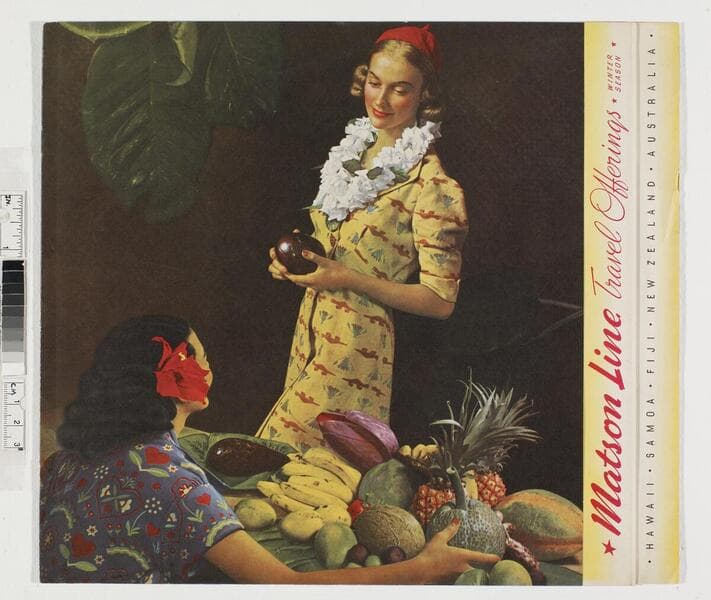 "A 314-13 (414-175M-238)"--printer's note, back cover, lower left, small type. "Copyright 1938 Matson Navigation Company"--p. [2], lower left corner, small type. "American travel service... Pasadena, Calif."--stamped, blue ink, back cover. Promotional information for Matson-Oceanic travel to Hawaii and the South Seas; including Hawaiian hotel accommodations, trip offerings, and fares. Focus of item: Lurline ; Mariposa ; Monterey ; Malolo.