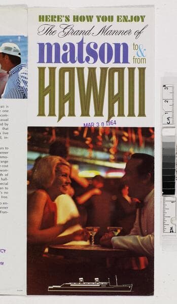 "LIT 127... 43M 965"--printer's note, back cover, bottom, small type. "Pomona travel agency.... Pomona, Calif."--stamped, purple ink, back cover. "MAR 8 1966"--stamped, purple ink, front cover. Promotion for travel to Hawaii via Matson ships; including regulations, accommodations, shipboard amenities, and vessel description. Focus of item: Lurline.