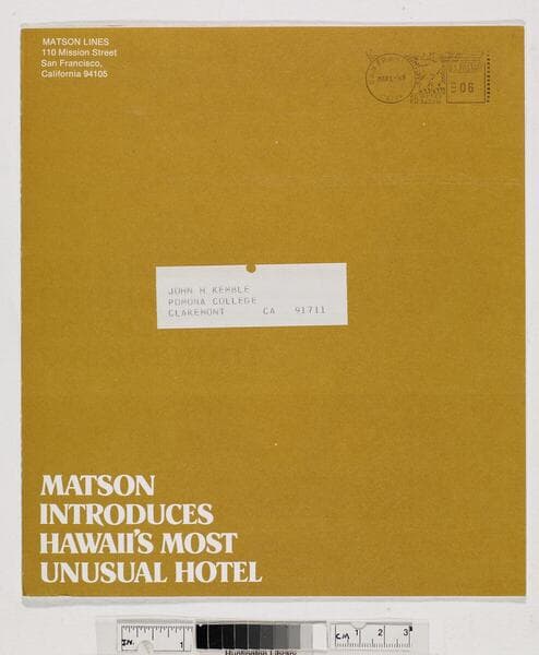 "FEB 28 '69"--postage stamp, black ink, front cover, upper right corner. "William C Moore 40 Martindale, Road Short Hills, NJ 07078"--address label, front cover. Advertisement for cruises to and around the Hawaiian islands; including schedules, vacation packages, shore activities, reservation details, and business reply detachment. Focus of item: Lurline.