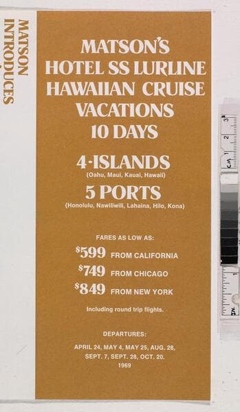 Matson's Hawaii super cruises set for Fall '69 and 1970 : 10 great days aboard hotel S.S. Lurline cruising four islands