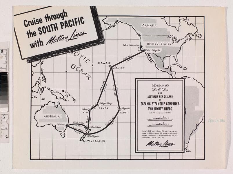 "Lit 214 Litho in U.S.A. 1070-50M"--printer's note, back cover, bottom. "Pomona travel agency... Pomona, Calif."--stamped, blue ink, back cover. "DEC 9 1970"--stamped, blue ink, front cover. "Issued October 1970"--front cover, lower right corner, small type. Information on South Seas cruise excursions; including tour information, pricing, itineraries, general conditions, and route map. Focus of item: Mariposa ; Monterey.