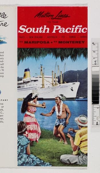 "(100M-155) Litho in U.S.A."--printer's note, back cover, bottom, small type. "Pomona travel agency... Pomona, California"--stamped, black ink, back cover. Promotion for South Pacific cruises; including a route map, vessel descriptions, destination information, and a deck plan. Focus of item: Mariposa ; Monterey.
