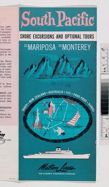 "Lit 214 Litho in U.S.A. 167 65M"--printer's note, back cover, bottom. "Pomona travel agency... Pomona, Calif."--stamped, purple ink, back cover. "JUL 24 1967"--stamped, purple ink, front cover. "January 1967"--front cover, lower right corner, small type. Information on South Seas cruise excursions; including tour information, pricing, itineraries, general conditions, and route map. Focus of item: Mariposa ; Monterey.