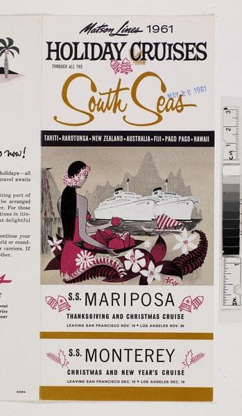 "Lit. 76... 0123456789"--printer's note, back cover, bottom, small type. "Pomona travel agency... Pomona, Calif."--stamped, blue ink, back cover. "APR 26 1961"--stamped, blue ink, front cover. Advertisement for fall cruises to the South Pacific; including itineraries, fares, theme cruise information, air-sea travel and destination descriptions. Focus of item: Mariposa ; Monterey.
