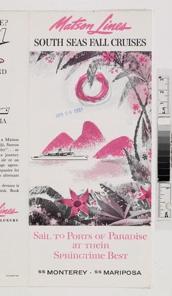 "Lit. 76... 0123456789"--printer's note, back cover, bottom, small type. "Pomona travel agency... Pomona, Calif."--stamped, blue ink, back cover. "APR 26 1961"--stamped, blue ink, front cover. Advertisement for fall cruises to the South Pacific; including itineraries, fares, theme cruise information, air-sea travel and destination descriptions. Focus of item: Mariposa ; Monterey.