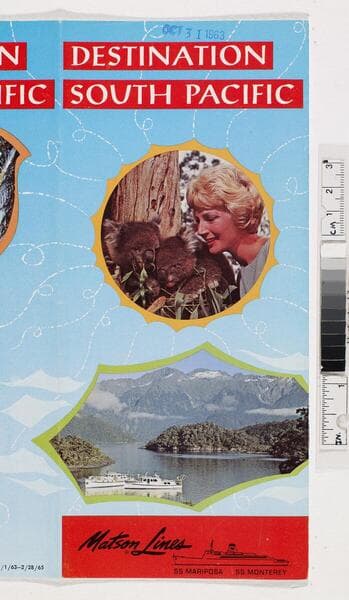 "Pomona travel agency... Pomona, Calif."--stamped, blue ink, back cover. "OCT 31 1963"--stamped, blue ink, front cover. "Valid 9/1/63--2/28/65"--back cover, lower right corner. Advertisement for South Pacific cruises; includes destination highlights, trip duration, sailing dates and general information. Focus of item: Monterey ; Mariposa.
