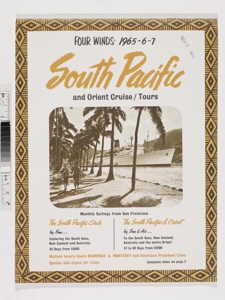 "Lit 214 Litho in U.S.A. 167 65M"--printer's note, back cover, bottom. "Pomona travel agency... Pomona, Calif."--stamped, purple ink, back cover. "JUL 24 1967"--stamped, purple ink, front cover. "January 1967"--front cover, lower right corner, small type. Information on South Seas cruise excursions; including tour information, pricing, itineraries, general conditions, and route map. Focus of item: Mariposa ; Monterey.