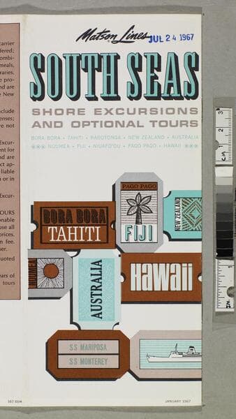 "Lit 214 Litho in U.S.A. 168 70M"--printer's note, back cover, bottom. "Pomona travel agency... Pomona, Calif."--stamped, purple ink, back cover. "APR 17 1969"--stamped, purple ink, front cover. "January 1968"--front cover, lower right corner, small type. Information on South Seas cruise excursions; including tour information, pricing, itineraries, general conditions, and route map. Focus of item: Mariposa ; Monterey.