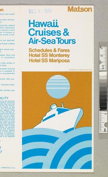 "Lit. 1 effective: Aug. 29, 1970 to Nov. 1, 1971 Litho in U.S.A."--printer's note, back cover, bottom, small type. "Pomona travel agency... Pomona, Calif."--stamped, blue ink, back cover. "SEP 21 1970"--stamped, blue ink, front cover. Information for Hawaii air-sea tours; including schedules, cruise and air fares, ship accommodations, reservations, sailing information, inter-island tours, and general information. Focus of item: Mariposa ; Monterey.
