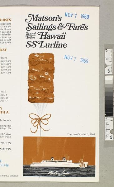 "Lit 1 litho U.S.A. 012345"--printer's note, back cover, bottom, small type. "Issued January 2, 1970"--front cover. "Pomona travel agency... Pomona, Calif."-stamped, blue ink, back cover. "FEB 23 1970"--stamped, blue ink, front cover. Information on Hawaii cruises; including schedules, fares, itineraries, and general information. Focus of item: Lurline.