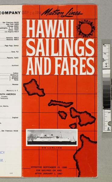 "Lit. 1 litho in U.S.A. 2345"--printer's note, back cover, bottom, small type. "Effective September 19, 1966 for sailings on and after January 1, 1967"--front cover. "Pomona travel agency... Pomona, Calif."--stamped, blue ink, back cover. "SEP 14 1966"--stamped, blue ink, front cover. Advertising of SS Lurline cruises; including inter-island schedules, sailing information, sailing schedule and itinerary for California-Hawaii cruises, and fares. Focus of item: Lurline.