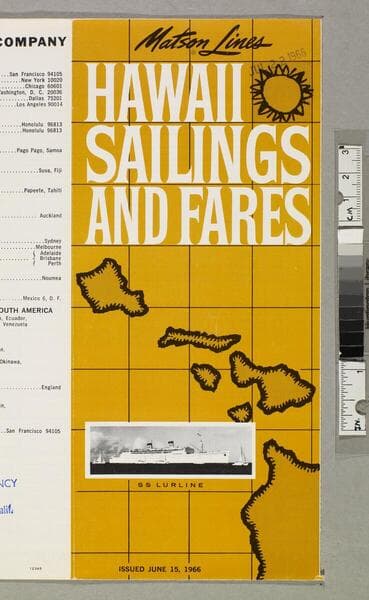 "Lit. 1 Litho in U.S.A. 89012345"--printer's note on back cover, bottom, small type. "Issued March 1, 1966"--front cover, bottom. "APR 11 1966"--stamped, blue ink, front cover. "Pomona Travel Agency... Pomona, Calif."--stamped, blue ink, back cover. Timetables and fares for SS Lurline cruises between California and Honolulu; including four-island cruises, general information and sailing information. Focus of item: Lurline.