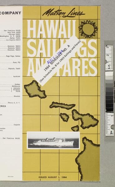 "Lit. 1 Litho in U.S.A. 789"--printer's note on back cover, bottom, small type. "Issued January 1, 1965"--front cover, bottom. "MAY 1 1965"--stamped, blue ink, front cover. "Pomona travel agency... Pomona, Calif."--stamped, blue ink, back cover. Timetables and fares for SS Lurline cruises between California and Honolulu; including four-island cruises, general information and sailing information. Focus of item: Lurline.