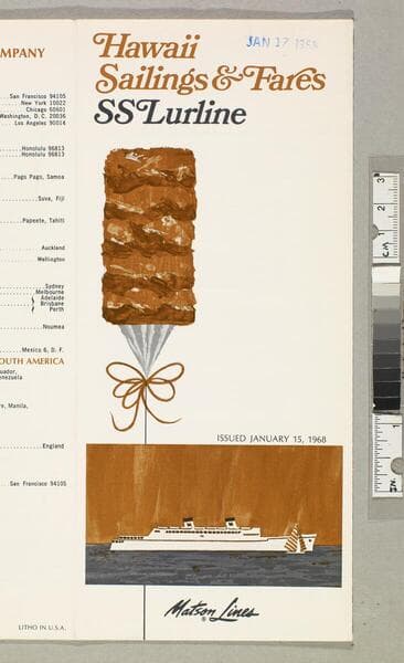 "Lit 1 litho in U.S.A."--printer's note, back cover, bottom, small type. "Issued January 15, 1968"--front cover. "Pomona travel agency... Pomona, California"--stamped, blue ink, back cover. "MAY 7 1968"--stamped, blue ink, front cover. Advertisement of SS Lurline cruises; including fares and schedules for Hawaii-California route, California coastal cruise schedule and fares, itineraries, sail dates and descriptions for theme cruises, and agent contact information. Focus of item: Lurline.