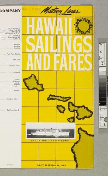 "Lit. 1 Litho in U.S.A. 890123"--printer's note, back cover, bottom, small type. "Issued February 14, 1963"--front cover, bottom. "FEB 26 1963"--stamped, black ink, twice on front cover, once on back cover. "Pomona travel agency... Pomona, California"--stamped, blue ink, back cover. Timetable and fares for cruises between California and Honolulu; including four-island holiday cruise, sailing information, accommodation descriptions, and general information. Focus of item: Lurline ; Matsonia.