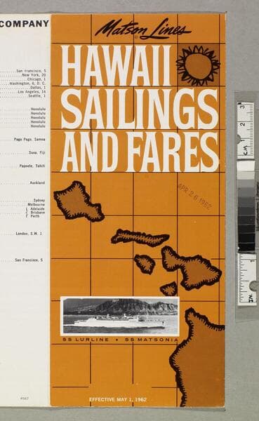"Lit. 1 Litho U.S.A. 67890"--printer's note, back cover, bottom, small type. "Issued September, 1962"-- front cover, bottom. "SEP 25 1962"--stamped, blue ink, front cover. "Pomona travel agency... Pomona, Calif."--stamped, blue ink, back cover. Timetable and fares for cruises between California and Honolulu; including accommodation details, sailing information, and general information. Focus of item: Lurline ; Matsonia.