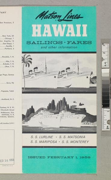"Lit. 1 (95M7992-358) Litho in U. S. A."--printer's note, back cover, bottom. "Issued April 1, 1958"--front cover. "Pomona travel agency... Pomona, California"--stamped, blue ink, back cover. At head of title: Matson Lines. Sailing and fares schedules for cruises between California and Honolulu; including accommodation descriptions, sailing information, and general information. Focus of item: Lurline ; Matsonia ; Mariposa ; Monterey .