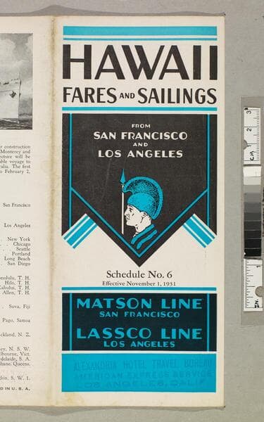 "PX. 52 (15M 3449-3-32) Printed in U. S. A."--back cover, bottom. "Schedule No. 8 issued March 1, 1932"--front cover. "Henry Miele travel service... Los Angeles, Calif."--stamped, blue ink, front cover. Sailing schedule and fares for cruises between California and Honolulu; including children and infant fares, inter-island trips, passenger regulations and information, schedules and fares for South Pacific cruises, and advertisement for tours and cruises.