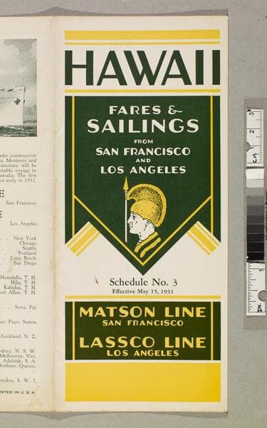 "PX. 52 (15M 3449-3-32) Printed in U. S. A."--back cover, bottom. "Schedule No. 8 issued March 1, 1932"--front cover. "Henry Miele travel service... Los Angeles, Calif."--stamped, blue ink, front cover. Sailing schedule and fares for cruises between California and Honolulu; including children and infant fares, inter-island trips, passenger regulations and information, schedules and fares for South Pacific cruises, and advertisement for tours and cruises.