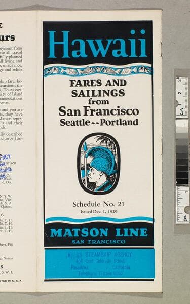 "A333. (P. 3-30-15M) Printed in U. S. A."--back cover, bottom. "Issued March 1, 1930"--front cover. "Ferguson travel service... Los Angeles, California"--front cover, stamped, purple ink. Sailing schedule for cruises between San Francisco, Seattle, Portland, Hawaii and the South Pacific; including inter-island cruises, and "air plane service".