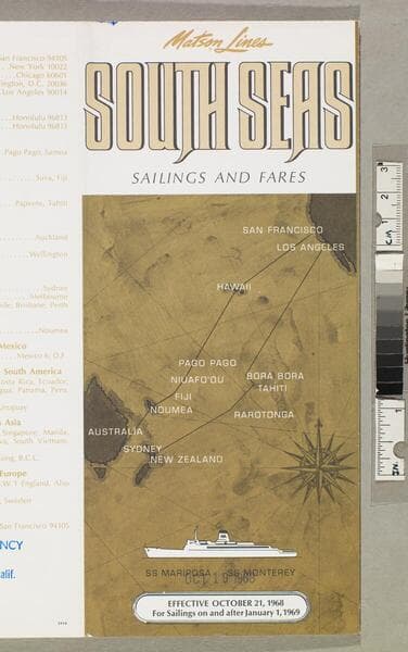 "Lit. 56 Litho in U. S. A. 90123"--back cover, bottom. "Effective October 16 for sailings on and after January 16, 1966"--front cover. "Pomona travel agency... Pomona, Calif."--back cover, stamped, blue ink. At head of title: Matson Lines. Sailing schedule and fares for South Pacific cruises; including accommodation descriptions, general information, itineraries, and route map. Focus of item: Mariposa ; Monterey.