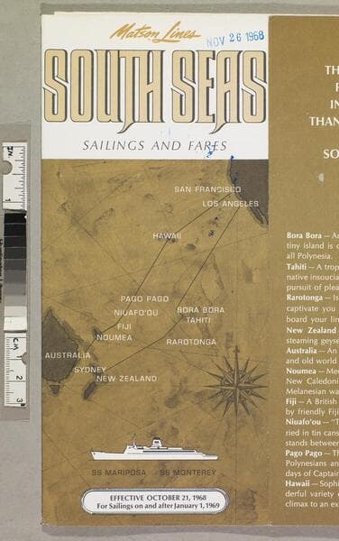 "Lit. 56 Litho in U. S. A. 3456"--back cover, bottom. "Effective October 21, 1968 for sailings on and after January 1, 1969"--front cover. "Pomona travel agency... Pomona, Calif."--back cover, stamped, blue ink. "OCT 19 1968"--front cover, stamped, black ink. At head of title: Matson Lines. Sailing schedule, fares and trip information for cruises between the South Pacific, Hawaii and California; including special cruise features, general information, accommodation descriptions, route map, and itinerary. Focus of item: Mariposa ; Monterey.