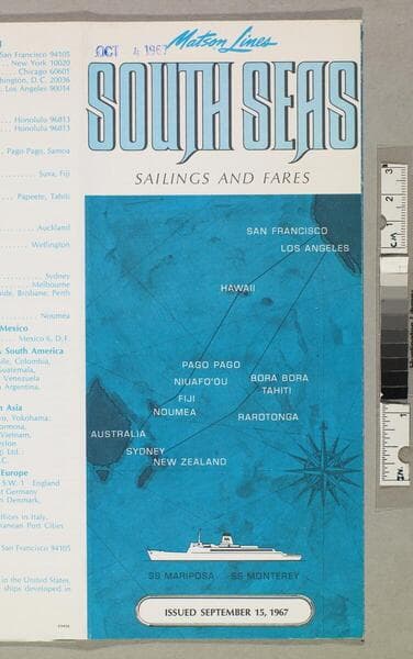 "Lit. 56 Litho in U. S. A. 123456"--back cover, bottom. "Effective September 19, 1966 for sailings on and after January 1, 1967"--front cover. "Pomona travel agency... Pomona, Calif."--back cover, stamped, blue ink. "OCT 26 1966"--front cover, stamped, blue ink. At head of title: Matson Lines. Sailing schedule and fares for South Pacific cruises; including accommodation descriptions, general information, itineraries, and route map. Focus of item: Mariposa ; Monterey.