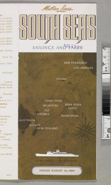 "Lit. 56 Litho in U. S. A. 7890"--back cover, bottom. "Issued March 1, 1965 for sailings on and after May 30, 1965"--front cover. "Pomona travel agency... Pomona, Calif."--back cover, stamped, blue ink. "MAR 23 1965"--front cover, stamped, blue ink. At head of title: Matson Lines. Sailing schedule and fares for South Pacific cruises; including accommodation descriptions, general information, special interest cruises, itineraries, and route map. Focus of item: Mariposa ; Monterey.