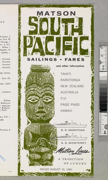 "Lit. 56 Litho in U. S. A. 012345"--back cover, bottom. "Issued September 1, 1962"--front cover. "Pomona travel agency... Pomona, Calif."--back cover, stamped, blue ink. "OCT 31 1962"--front cover, stamped, blue ink. Sailing schedule, fares, and trip information for South Pacific cruises; including accommodation descriptions, itineraries, route map, general information, and special cruises. Focus of item: Mariposa ; Monterey.