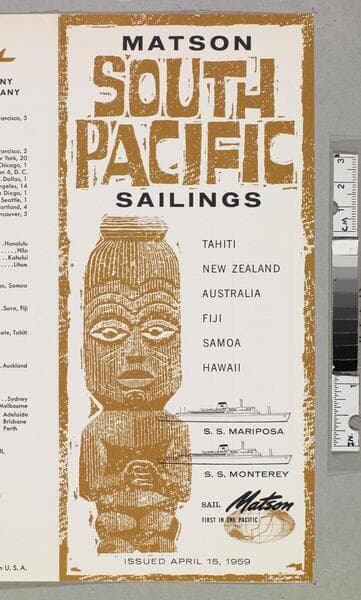 "Lit. 13 (75M544-759) Litho in U. S. A."--back cover, bottom. "Issued August 15, 1959"--front cover. "Pomona travel agency... Pomona, Calif." ; "AUG 21 1959"--back cover, stamped, blue ink. Sailing schedule for South Pacific cruises; including itineraries and port descriptions. Focus of item: Mariposa ; Monterey.