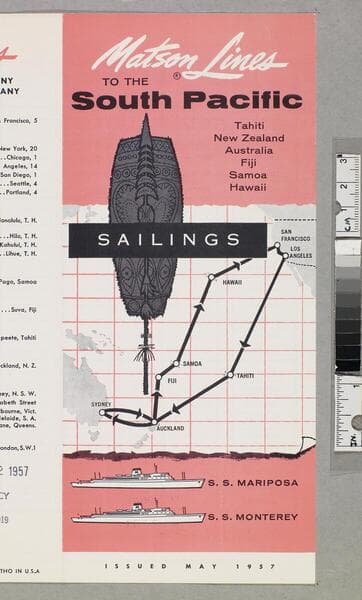 "(45M-557) Lit 13 Litho in U. S. A."--back cover, bottom. "Issued May 1957"--front cover, bottom. "SEP 12 1957" ; "Pomona travel agency... Pomona, California"--back cover, stamped, black ink. Sailing schedule for South Pacific cruises; including minimum fares. Focus of item: Mariposa ; Monterey.
