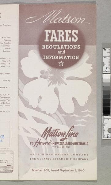 "No. 66 effective March 1, 1938"--front cover. "PX52 (426-30M-238) Printed in U. S. A."--p. 16, bottom. "American travel service... Pasadena, Calif."--back cover, stamped, blue ink. Sailing schedule and fares for cruises between California, Hawaii and the South Pacific; including accommodation descriptions, itineraries, escorted cruises, inclusive independent tours of Australia and New Zealand, passenger regulations and general information.