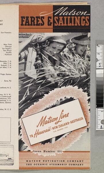 "Effective February 1, 1939"--front cover. "PX52--No. 72 (456-30M-239) Printed in U. S. A."--p. 16, bottom. "American travel service... Pasadena, Calif."--back cover, stamped, blue ink. Sailing schedule and fares for cruises between California, Hawaii and the South Pacific; including accommodation descriptions, itineraries, rail trip information for Australia and New Zealand, escorted cruises, inclusive independent tours of Australia and New Zealand, passenger regulations and general information.