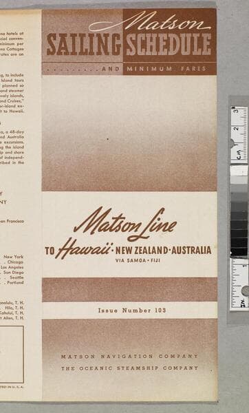 "Number 106, issued march 1, 1940"--front cover. "PX51--(12-30M-240) Printed in U. S. A."--back cover, bottom. "American travel service... Pasadena, Calif."--back cover, stamped, blue ink. Ms. inscriptions in red pencil on p. 2. Sailing schedule and minimum fares for cruises between California, Hawaii and the South Pacific; including Hawaiian hotel reservations, Hawaii tour information and accommodation descriptions.