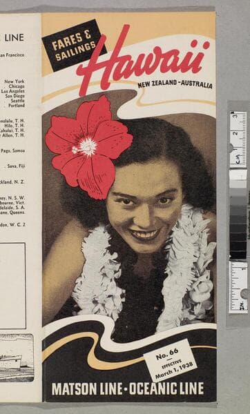 "Effective December 1, 1938"--front cover. "PX52--No. 71 (451-30M-1138) Printed in U. S. A."--p. 16, bottom. "Henry Miele travel service... Los Angeles"--back cover, stamped, blue ink. Ms. inscriptions in blue ink on p. 3. Sailing schedule and fares for cruises between California, Hawaii and the South Pacific; including accommodation descriptions, itineraries, rail trip information for Australia and New Zealand, escorted cruises, inclusive independent tours of Australia and New Zealand, passenger regulations and general information.