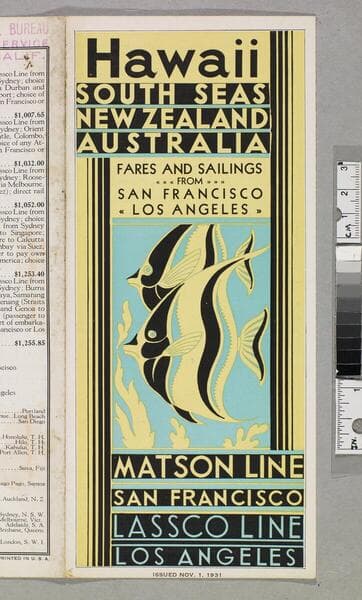 "PX. 52 (15M 3449-3-32) Printed in U. S. A."--back cover, bottom. "Schedule No. 8 issued March 1, 1932"--front cover. "Henry Miele travel service... Los Angeles, Calif."--stamped, blue ink, front cover. Sailing schedule and fares for cruises between California and Honolulu; including children and infant fares, inter-island trips, passenger regulations and information, schedules and fares for South Pacific cruises, and advertisement for tours and cruises.