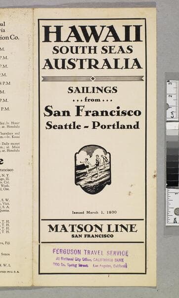 "A333. (P. 3-30-15M) Printed in U. S. A."--back cover, bottom. "Issued March 1, 1930"--front cover. Sailing schedule for cruises between San Francisco, Seattle, Portland, Hawaii, and the South Pacific: including inter-island cruise trips and "air plane service".