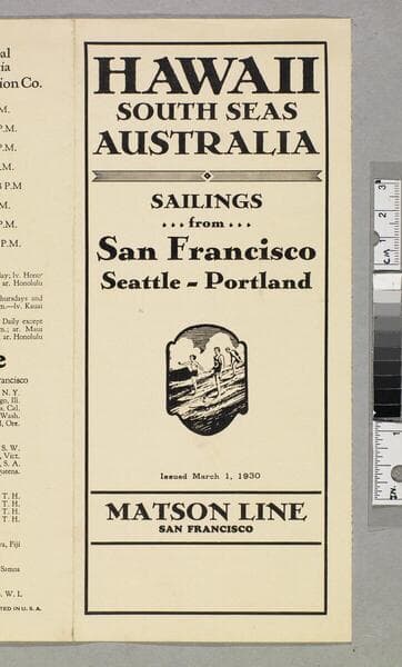 "A333. (P. 3-30-15M) Printed in U. S. A."--back cover, bottom. "Issued March 1, 1930"--front cover. "Ferguson travel service... Los Angeles, California"--front cover, stamped, purple ink. Sailing schedule for cruises between San Francisco, Seattle, Portland, Hawaii and the South Pacific; including inter-island cruises, and "air plane service".